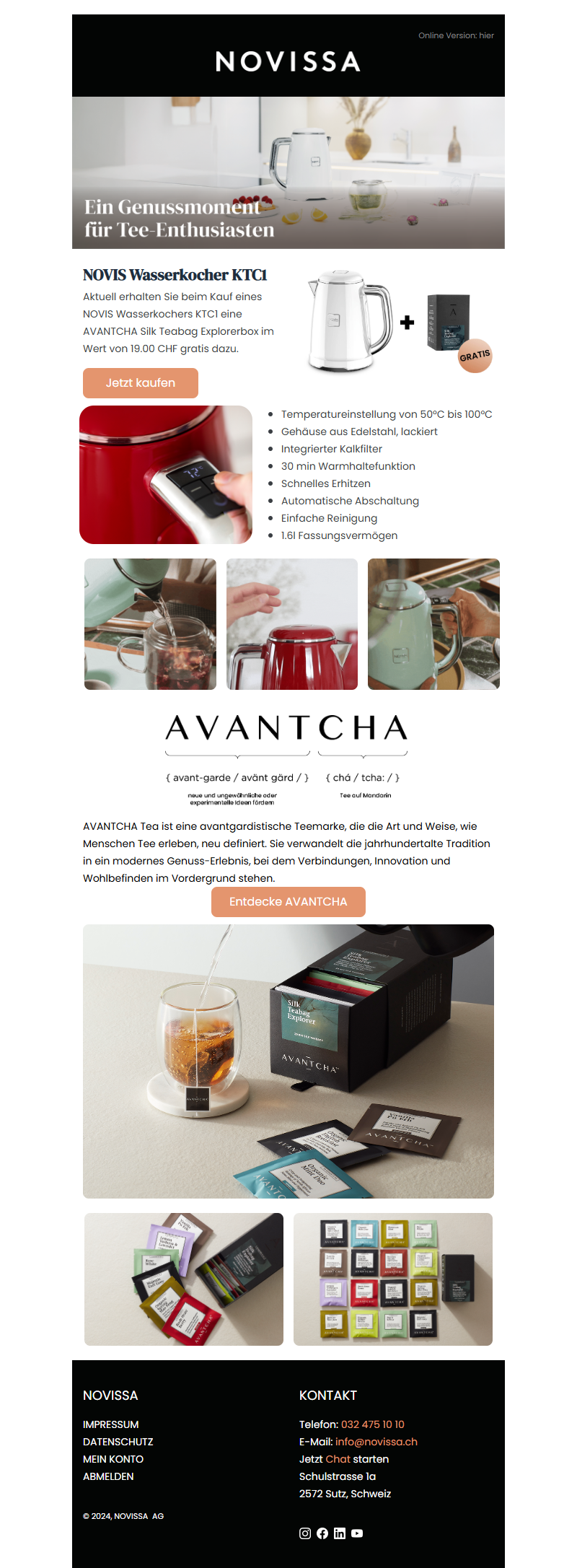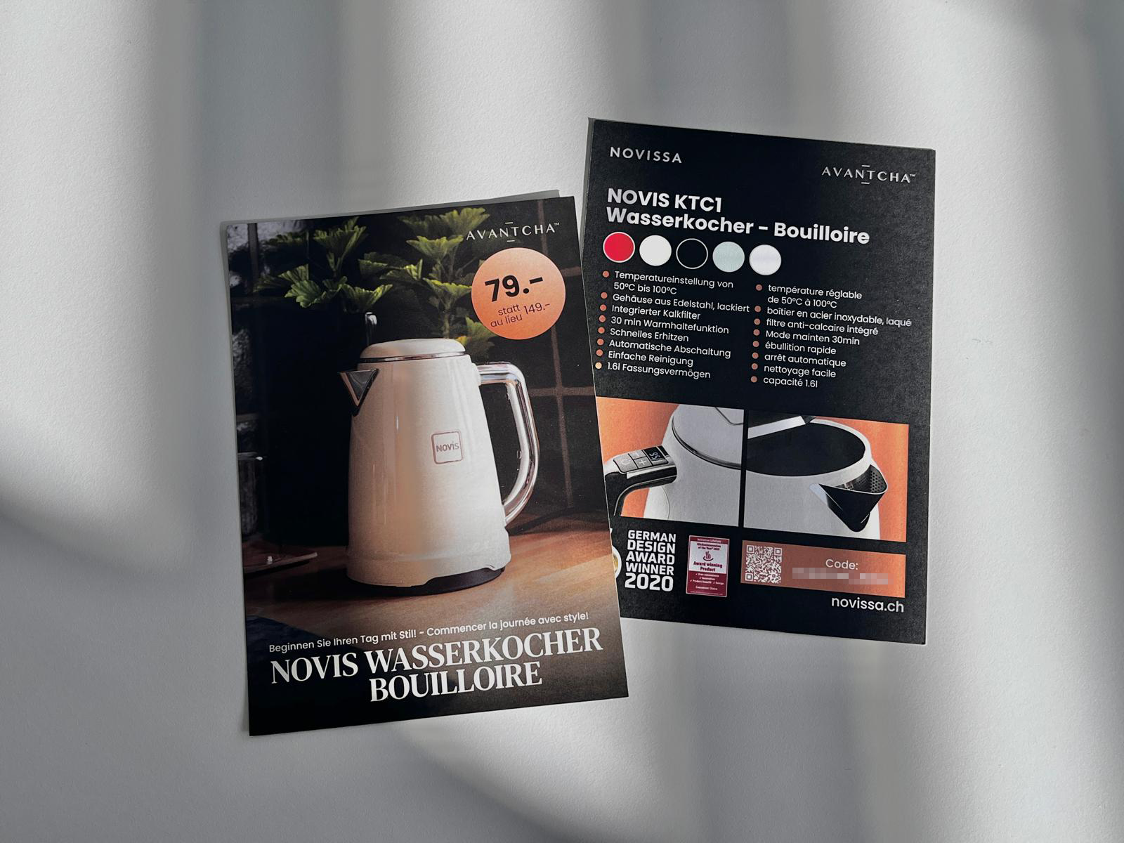 A6-Flyer und Newsletter, die an Kund:innen versendet wurden, um auf die Kooperation zwischen Novis und AVATCHA aufmerksam zu machen.